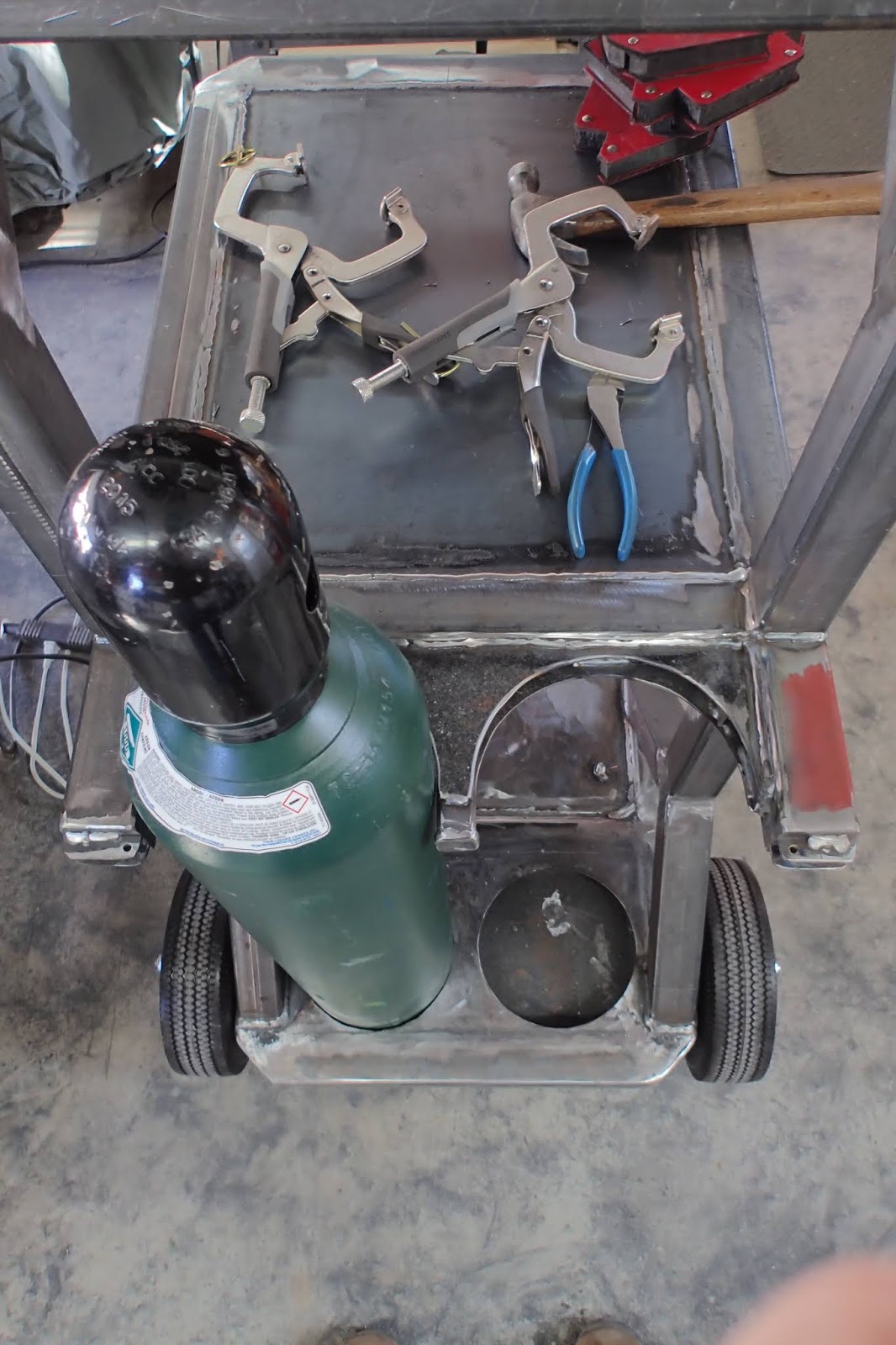 Building the base. If you've built a fab welding table, you might as well use it and try to keep things 'straight'.As I mentioned, grinding/buffing wheels did a great job to mask my 'basic' welding skills... base finished.Basic tower done... now on to the shelves, etc.Shelves and basic tower done.Base plate and storage drawers (a little filing cabinet will do) done for now. Gotta build a base in the back for the gas bottles...Cut and welded in, the holds for the bottles done.5/8" axle threaded and welded to the base with 5" flat-free wheels in the back and 4" swivel wheels up front. Done.
